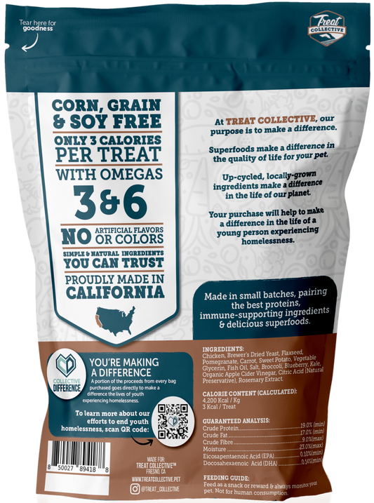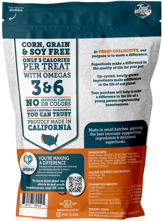 Our treats are made with simple, real ingredients sourced straight from California’s finest farms. Every bite is free from artificial flavors, fillers, and preservatives—just wholesome superfoods like sweet potato, kale, and salmon. Proudly crafted in the heart of California, we ensure your pup gets the best while supporting sustainable farming practices. Treat your dog to nutrient-packed goodness they’ll love and you can trust!